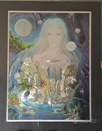 L'immagine mostra una figura femminile eterea con lunghi capelli fluenti, circondata da elementi naturali e celesti, di Robin Koni titolo "Enchanted Pool", 20x25 cm, 20 euro