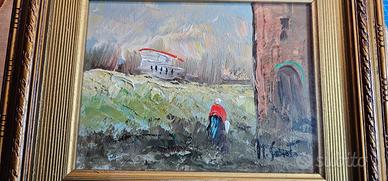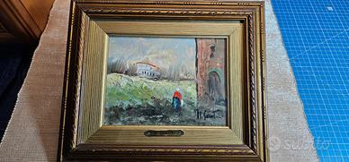 Coppia di quadretti vintage del pittore M. Santini dipinti a olio, cornice in legno ricca di particolari, riproduce paesaggi in stile realistico rurale. Prezzo trattabile.