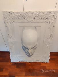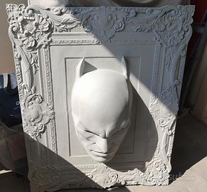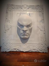 Questo quadro tridimensionale del volto di Batman, scolpito con maestria in rilievo, è incastonato in una cornice barocca dallo stile sontuoso, dando vita a un contrasto visivo potente tra il classico e il moderno.