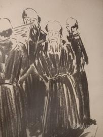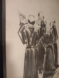 quadro 70×50 firma vallesi 1976 a carboncino, raffigurazione religiosa di frati in tempo libero