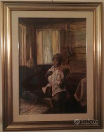 Quadro a olio raffigurante un violinista che suona seduto sul letto.