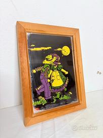 Vendo delizioso quadretto vintage con illustrazione di bambini, caratterizzato da colori vivaci su sfondo scuro specchiato e cornice in legno.