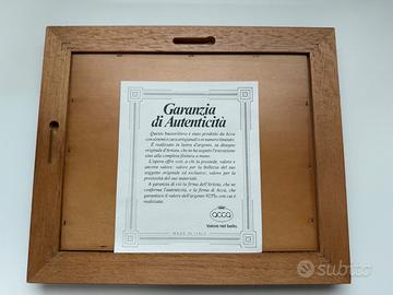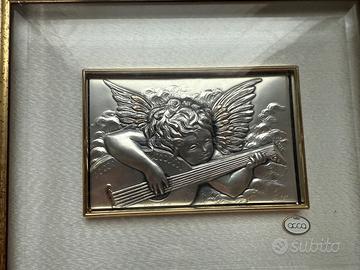 Vendo raffinato bassorilievo firmato ACCA Castellani, realizzato in argento 925‰ su disegno originale d'artista. Raffigura un angelo musicista tra le nuvole, rifinito a mano. Cornice in legno con profilo dorato, certificato di autenticità applicato sul retro, completo della sua custodia originale in velluto ACCA.