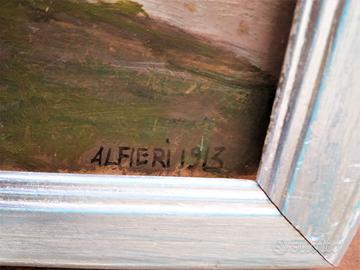 Quadro ad olio, su faesite, firmato Attilio Alfieri, Rappresentante filare di alberi in fiore. XX secolo. Dim. 250x325 mm.