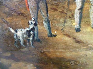 Quadro ad olio su tela "Paesaggio con montagne, fiume e due personaggi con cagnolino" della metà dell'ottocento. In buono stato, era stato solamente pulito ( vedi prova all'ultima foto ). Non è firmato. Misura tela cm 50x60. Vecchia cornicetta in legno.
