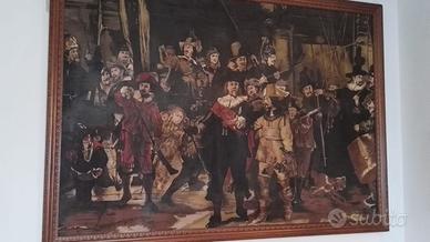 Quadro realizzato su tela ad olio delle dimensioni di 1,91 di larghezza x 1,36 di altezza con cornice in legno intarsiato, è una coppia della RONDA DI NOTTE DEL PITTORE REMBRANDT, è stata realizzata per un regalo di matrimonio intorno al 1950 da pittore anonimo