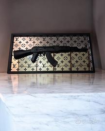 Al centro è montata una AK47 nera opaca (non funzionante, decorativa), che crea un contrasto forte e provocatorio tra lusso e potere, moda e ribellione.