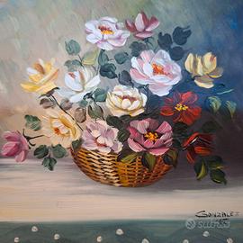 Dipinto a olio su tavola firmato GONZALES che rappresenta un cesto di vimini con fiori