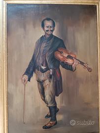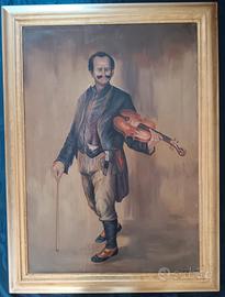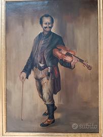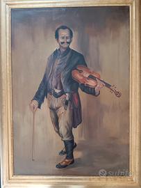 Elegante dipinto a olio su tela raffigurante un violinista in posa dinamica, realizzato in stile accademico tradizionale. La figura è caratterizzata da un abbigliamento di gusto popolare e da una resa pittorica morbida e armoniosa. Opera probabilmente eseguita nella prima metà del Novecento, ispirata ai modelli ottocenteschi di pittura di genere. Il dipinto presenta una piacevole patina del tempo con craquelure diffusa che ne attesta l’età. Completo di cornice dorata non coeva. Dimensioni completo di cornice 106 x 86 Dimensioni senza cornice 70 x 100.
