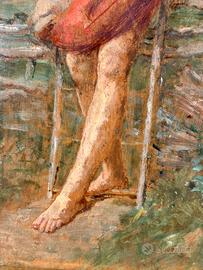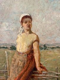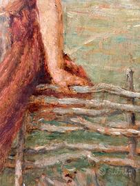 Olio su tavola raffigurante una giovane figura femminile a piedi nudi appoggiata a una staccionata, immersa in un ampio paesaggio rurale. La composizione è caratterizzata da toni caldi e da una pittura morbida e luminosa che restituisce con sensibilità l’atmosfera della campagna e la dimensione quotidiana della vita contadina.