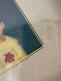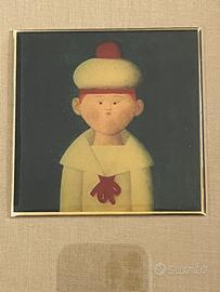 Piccolo dipinto originale su tela, firmato “A. Bueno” in basso a destra, attribuibile al pittore Antonio Bueno. L’opera raffigura una figura stilizzata dai tratti essenziali e delicati, riconducibile a un linguaggio naïf e figurativo, con richiami all’immaginario infantile tipico della produzione dell’artista. I colori sono morbidi e ben armonizzati, con un’atmosfera intima e sospesa. Il dipinto è valorizzato da una cornice in legno lavorato con ampio passepartout, che crea un elegante effetto di profondità e lo rende adatto sia ad ambienti classici che contemporanei.