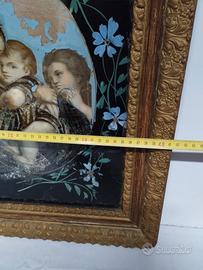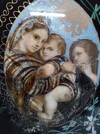 Quadro Arte Sacra inizio 900 rappresentante la madonna della sedia, costruito con una tecnica particolare che consisteva nell assemblaggio di parti di stampa carta stagnola colorata e parti decorate, come si vede dalle foto il quadro presenta diversi segni del tempo, mentre la cornice è in ottime condizioni. Si raccomanda in caso di acquisto di selezionare come spedizioniere BRT perché è l'unico che accetta dimensioni sufficienti per la spedizione di oggetti come questi.