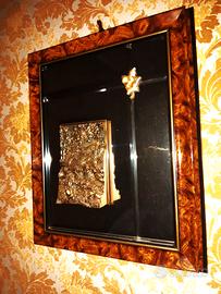 Vendo elegante quadro artistico decorativo con cornice in legno effetto radica, impreziosita da vetro frontale. L’opera presenta un elemento centrale in rilievo, dal forte impatto visivo e dal gusto classico, ideale per ambienti raffinati o dallo stile vintage.