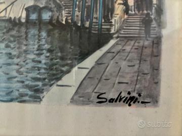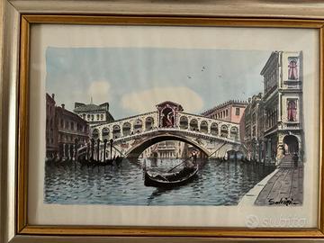 L’artista è Carlo Salvini (nato nel 1824 e morto nel 1899) dipinse solo Venezia. In questo quadro il soggetto è il famosissimo Ponte di Rialto. Acquerello, acrilico su carta, con cornice di pregio argento ed oro Cornice 43x33 Quadro 30x18