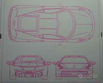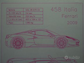Riproduzione stile blueprint della Ferrari 458 Italia, fatto a penna tramite pen plotter, dimensioni 30x45 cm.