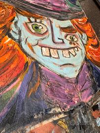 Quadri comprati ad un asta , realizzati a mano con pittura in rilievo su legno multistrato da 1 cm. Tratti dal film alice nel paese delle meraviglie Che raffigurano cappellaio matto ,brucaliffo , gatto . Misura 30x82 Prezzo trattabile se presi tutti e 3 insieme