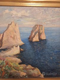 pittore caprese olio su tela dipinto a mano rappresenta marina piccola con i faraglioni capri cornice on legno.