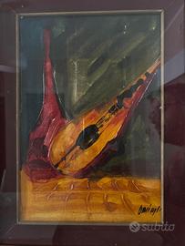 Quadro che richiama la musica, l'italianità data la presenza di un mandolino, dalle cromie non chiassose e pennellate in rilievo date da mano esperta. Un'opera moderna, con cornice di valore che esalta il dipinto. Dimensioni: -26x39 quadro; -42x54 cornice.