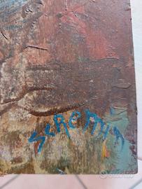 Artista: Pier Giovanni Scremin Tecnica: Olio su tavola Dimensioni: ca. 20 x 50 cm Periodo: XX secolo Descrizione: Questa vibrante opera di Pier Giovanni Scremin rappresenta una composizione floreale eseguita con tecnica materica e forte impatto cromatico. I fiori, nei toni caldi del rosso, giallo e arancio, emergono da uno sfondo astratto e vibrante, mentre il vaso blu, reso con pennellate decise, conferisce equilibrio e profondità alla scena. Il dipinto è caratterizzato da un uso ricco della spatola e da texture spesse, che donano alla superficie una forte presenza tattile e visiva. Firmato in basso a destra, è un bellissimo esempio della sensibilità pittorica di Scremin, artista noto per la sua capacità di fondere astrazione e figurazione. Condizioni: Ottime Cornice: Non presente (pronto per essere incorniciato a piacimento)