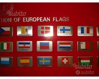 E' stata la prima raccolta ufficiale delle bandiere europee, realizzata in un numero di 5.000 pezzi per tutta l' europa, nel 1985, cioe' prima della caduta del muro di berlino. in un elegante espositore di legno con base in velluto rosso e copertura in vetro. vi sono 33 nicchie che contengono i singoli lingottini di circa 15 grammi cadauno, in argento 925/1000; ognuno reca sul fronte, serigrafata a colori, la bandiera della nazione a cui si riferisce la scritta posta alla sua base. Il quadro mis. 70x30cm. e i lingottini 3,5x2,5cm.e 2mm. di spessore. Il tutto con certificato originale e fattura di compera dell'epoca. Consegna personalmente a mano Ideale per un differente e originale regalo