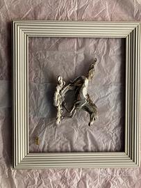 Quadro anni 80 con cornice dim. 40 X 35 cm e bassorievo su vetro di cavallo in argento 800 . Il cavallo si e’ staccato dal vetro ma può essere incollato