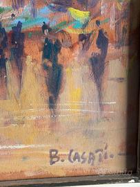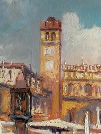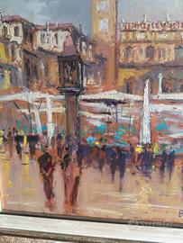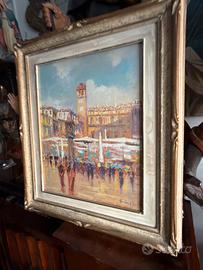 Dipinto su tavola raffigurante piazza delle erbe a Verona dipinta dal pittore Bruno Casati pittore quotato misure 70x69