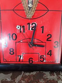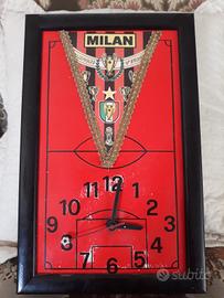 Quadro con orologio squadra calcio Milan da appendere a muro , per collezionisti , prodotto artigianale , leggermente scolorita la parte davanti , come da foto , orologio perfettamente funzionante con ausilio di pila stilo normale.Misure di 30 cm. di lunghezza x 19 cm. di larghezza.
