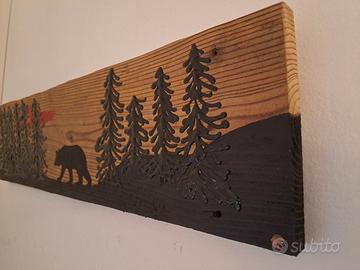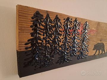 Quadro da montagna realizzato su un'asse di legno vecchio recuperata in montagna dipinta con un orso in un bosco di abeti dipinti in rilievo. Le misure sono 69x19 cm. Sul retro sono già montati due ganci per appenderla alla parete. Se abitate nelle vicinanze e volete venire a vedere di persona l’oggetto che vi interessa ed anche altri (senza nessun impegno da parte vostra) siete i benvenuti, scrivete un messaggio sulla chat tramite il pulstante “Contatta” per fissare un appuntamento. Per favore non chiedetemi il numero di telefono: è sufficiente che ci scriviamo nella chat, è il modo più sicuro sia per l’acquirente che per il venditore.