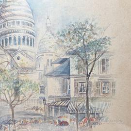 Quadro con stampa veduta di Place du Tertre a Paris con i suoi storici cafè e con molti pittori. Bei colori. Ottimo per arredamento. Vintage.