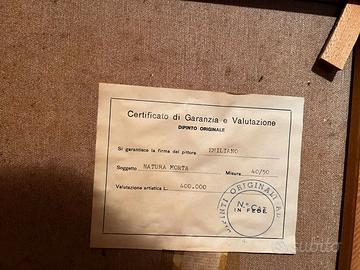 Vendo quadro d autore del pittore Emiliano rappresentante la natura morta con certificato di quotazione in lire.