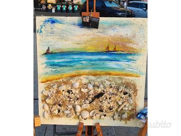 Opera materica ispirata al mare, realizzata con tecnica mista su supporto rigido. Il dipinto raffigura una spiaggia luminosa che sfuma in un mare turchese e in un cielo caldo dai toni dorati, attraversato all’orizzonte da piccole barche a vela che evocano quiete e libertà.