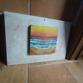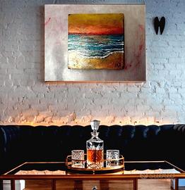 Dipinto originale realizzato su lastra di marmo, montata su base in legno, che conferisce solidità ed eleganza all’opera. La scena raffigura un mare mosso che si infrange dolcemente sulla riva, sotto un cielo acceso dai colori del tramonto: giallo, arancio e rosso si fondono creando un’atmosfera calda e suggestiva.