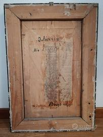 Quadro intarsiato di Fra Topolino. Alcuni intarsi sono saltati. Cornice non perfetta. Sul retro del quadro notizie sull'autore. La dimensione, completa di cornice, è di 46x66 cm.