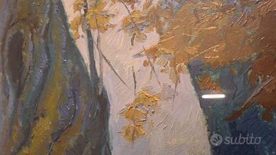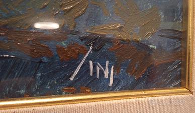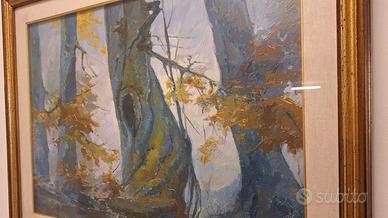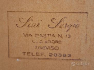 Quadro olio su tela di Sergio Sini (1924–1986) – Paesaggio alpino Dipinto a olio su tela raffigurante un suggestivo paesaggio boschivo alpino, tipico della produzione di Sergio Sini. Pittore trevigiano del secondo Novecento, Sergio Sini è noto per i suoi paesaggi naturali, in particolare della Val Pusteria e delle Dolomiti, caratterizzati da una forte sensibilità per la luce e il colore. L’opera presenta una pennellata ricca e vibrante, con tonalità fredde (azzurri e verdi) in contrasto con inserti caldi e leggere velature dorate, che risaltano con l’illuminazione creando interessanti effetti luminosi. Firmato in basso a destra. Sul retro è presente il timbro della galleria dell’artista (Treviso). Dimensioni: 80 x 60 cm Venduto completo di cornice con vetro. Artista documentato con mostre dedicate, tra cui: * “La mia Pusteria” (Villabassa, 2024) * esposizioni presso Barchessa Villa Quaglia (Treviso) Disponibile per ulteriori foto o informazioni.