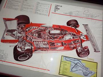 - Ferrari F1 312 T 1975 pilota Niki Lauda N. 12, vincitrice del mondiale piloti e costruttori, vista spaccato con organi meccanici, vista frontale, vista laterale, dati tecnici, tracciato di prova della pista di Fiorano, disegno di Tony Matthews, dimensione del quadro 55x43x2cm, peso 1,700kg, prezzo 50 euro;