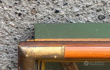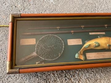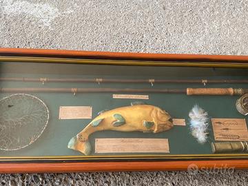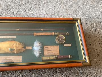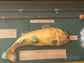 Quadro Diorama Pesca a Mosca Vintage - Trota 3D. Esclusiva bacheca espositiva tridimensionale (diorama) dedicata all'arte della pesca a mosca, un pezzo da collezione raro e di grande impatto estetico. Questo quadro 3D non è una semplice decorazione, ma una vera e propria rassegna storica e tecnica racchiusa in una raffinata cornice di pregio. Caratteristiche e dettagli della composizione: • Soggetto Centrale: Riproduzione artistica dettagliata di una Trota Iridea (Rainbow Trout) con targhette descrittive su classificazione, habitat e distribuzione. • Attrezzatura Vintage: Include una canna da pesca in legno, un mulinello storico modello Hardy Silex Reel (1911), un guadino a rete con manico in legno e una selezione di mosche artificiali artigianali. • Sezione Tecnica: Infografica d'epoca con illustrazioni dei nodi classici (Albright knot, Turle knot) e accessori come il "Priest" per la pesca. • Materiali di Alta Qualità: Cornice in legno massiccio con eleganti angolari rinforzati in ottone borchiato. Fondo in tessuto verde foresta che esalta i colori naturali degli elementi esposti. Dimensioni accurate: • Ingombro esterno totale: 83 x 27 cm • Base posteriore per eventuale incasso: 78,5 x 23,5 cm • Spessore / Profondità: 8,5 cm (perfetto per risaltare su ogni parete). Lo stile "Old English" e la cura dei dettagli lo rendono un’idea regalo prestigiosa per pescatori esperti e appassionati di antiquariato sportivo. Condizioni: L'oggetto è in ottime condizioni, come da foto. La struttura è solida e completa di cordino posteriore originale, pronta per essere appesa. Spedizione tracciata con imballaggio professionale ultra-rinforzato: il diorama verrà protetto con pluriball a bolle grandi e doppio strato di cartone rigido per garantire l'integrità del vetro e dei componenti interni durante il trasporto.