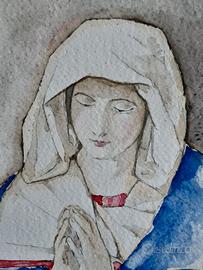 Quadro dipinto a mano in grafite ed acquerelli su cartoncino 18 x 24 cm. ispirato al dipinto del 1640 ca. di Battista Salvi da Sassoferrato "Madonna Orante".