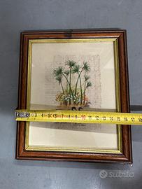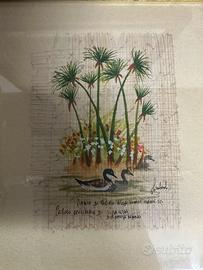 Bellissimo quadro dipinto a mano, raffigurante piante di papiro e uccelli acquatici, realizzato su papiro originale di Siracusa. - Dipinto con colori tenui e delicati. - Presenta una cornice in legno color legno chiaro e beige. - Perfetto per decorare la tua casa con un tocco di arte artigianale.