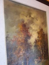 DISPONGO DI COPPIA - Vendo un dipinto ad olio sembra su tela grezza con firma da identificare - raffigura un paesaggio rurale con strada di campagna - con cornice in legno e passapartout con STOFFA A RICAMO sembra di pregio - Alto cm 74 - largo cm 50 - Buone condizioni come da foto - info senza problemi - Grazie