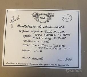 Certificazione di autenticità di dipinto olio su tela.