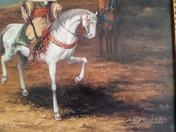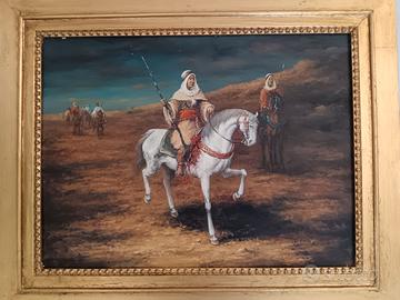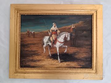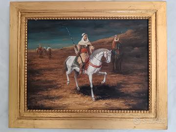 Dipinto a olio su tavola raffigurante scena orientalista con cavaliere arabo su cavallo bianco, accompagnato da altri cavalieri sullo sfondo desertico. Opera decorativa della seconda metà del Novecento, caratterizzata da una piacevole resa cromatica nei toni caldi della terra e del cielo crepuscolare. Cornice dorata inclusa. Dimensioni con cornice: 42 x 52 cm Dimensioni dipinto: 30 x 40 cm Buone condizioni generali, normali segni del tempo