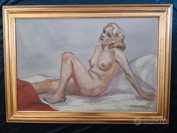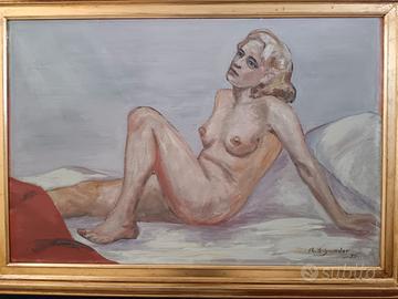 Elegante dipinto ad olio su pannello raffigurante un nudo femminile reclinato, firmato in basso a destra e datato 1935. L’opera si distingue per la raffinata resa degli incarnati e per la composizione armoniosa, riconducibile alla pittura figurativa europea della prima metà del Novecento, con richiami allo stile accademico e al realismo dell’epoca. Colori delicati e atmosfera intima rendono questo quadro particolarmente decorativo e adatto ad ambienti classici o moderni. Tecnica olio su pannello Firma presente in basso a destra Cornice in legno dorato inclusa Condizioni buone, con lievi segni del tempo coerenti con l’età dell’opera Dimensioni completo di cornice 108 x 76. Dimensioni senza cornice 92 x 61.