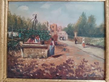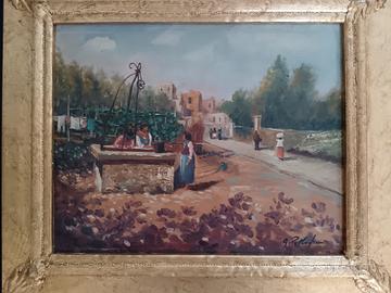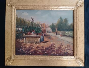 Dipinto a olio su pannello raffigurante scena di vita contadina con figure femminili presso un pozzo, ambientato in paesaggio rurale con architetture sullo sfondo. Opera firmata A. Palladino in basso a destra, databile alla seconda metà del Novecento. Pennellata morbida e luminosa, con richiami alla pittura impressionista italiana. Condizioni ottime. Cornice in legno foglia oro inclusa. Dimensioni con cornice 40 x 34 cm senza cornice 30 x 24 cm