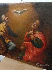dipinto olio su tela, datato da esperto primo 700 scuola napoletana, raffigurante i santi Pietro e Paolo , colomba al centro e Cherubini lato sinistro della tela. 2 restauri eseguiti; negli anni 80 è stato rintelato e recentemente è stata accuratamente restaurata la pittura ( posso dimostrare cn foto del prima restauro) . misure 38x32 . voluto offerte. no perditempo o affaristi.