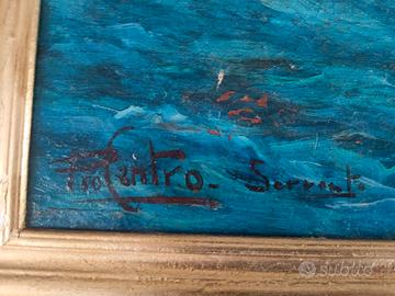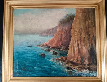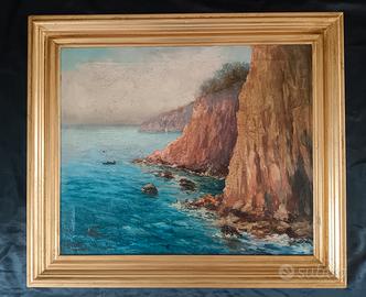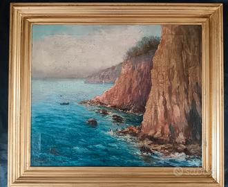 Dipinto olio su tela raffigurante una scogliera della costiera sorrentina, firmato “Pio Centro”. Opera di scuola napoletana, databile alla prima metà del ‘900, caratterizzata da una piacevole resa cromatica del mare e delle rocce. Tela originale con craquelure del tempo, con segni dell'età visibili in foto. Completo di cornice dorata. Dimensioni con cornice: 65 x 75 cm Dimensioni tela: 60 x 50 cm