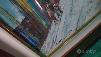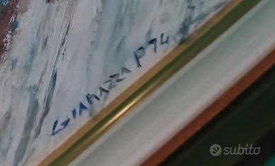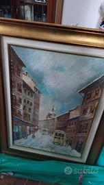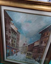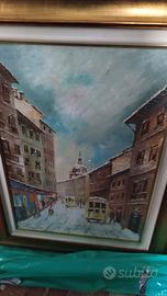 grande quadro dipinto olio su tela soggetto Tram Milano cornice dorata ottimo stato firmato possibile ritiro a Milano