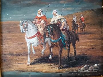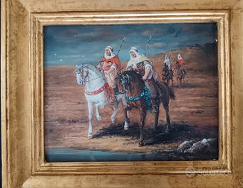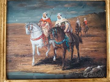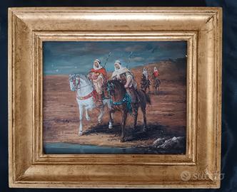 Elegante dipinto orientalista raffigurante cavalieri a cavallo in paesaggio desertico, realizzato ad olio su tavola nella seconda metà del XX secolo. La scena, di forte impatto narrativo, presenta due figure principali in primo piano e altri cavalieri sullo sfondo, con una buona resa dei movimenti e dei dettagli dei cavalli valorizzata dai contrasti con il cielo e i finimenti. Dimensioni senza cornice: 20 x 25 cm Dimensioni con cornice: 30 x 35 cm Cornice in legno foglia oro inclusa.
