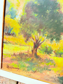 Vendo quadro con dipinto raffigurante un paesaggio collinare dai toni caldi e avvolgenti, firmato “Assani” in basso a sinistra. La scena presenta una natura tranquilla con alberi e colline. L’opera è incorniciata con una cornice bianca che ne valorizza i colori. In buone condizioni generali, ideale per ambienti rustici o classici.