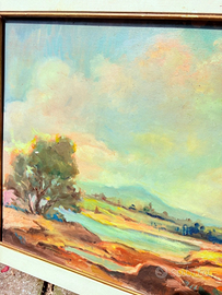 Vendo quadro con dipinto raffigurante un paesaggio collinare dai toni caldi e avvolgenti, firmato “Assani” in basso a destra. La scena presenta una natura tranquilla, con alberi, colline e un corso d’acqua che attraversa la campagna. L’opera è incorniciata con una cornice bianca che ne valorizza i colori. In buone condizioni generali, ideale per ambienti rustici o classici.