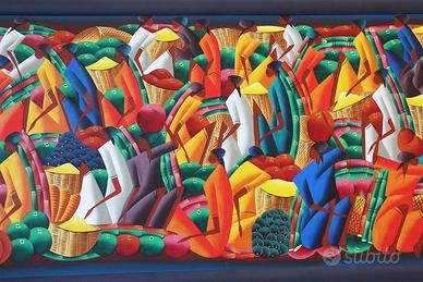 Privato vende elegante e moderno quadro etnico con rappresentazione di scena di mercato del popolo caraibico, dai colori vivaci e brillanti.